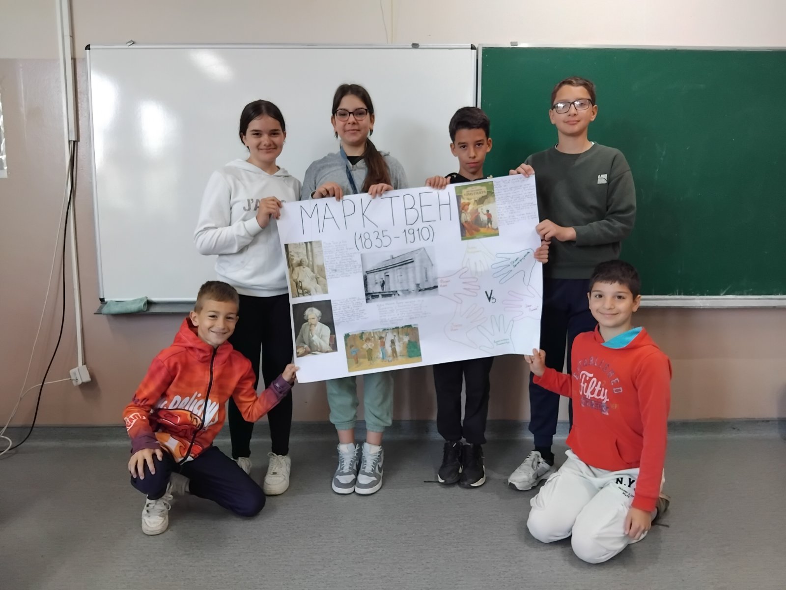 Угледни час “Том Сојер” Ученици 5/3, 5/4 и 5/5 су на часу српског језика имали угледни час „Том Сојер“. Најпре су у сарадњи са библиотекарком и наставницом информатике направили паное и презентације о аутору романа, Марку Твену и то су представили на часу српског…