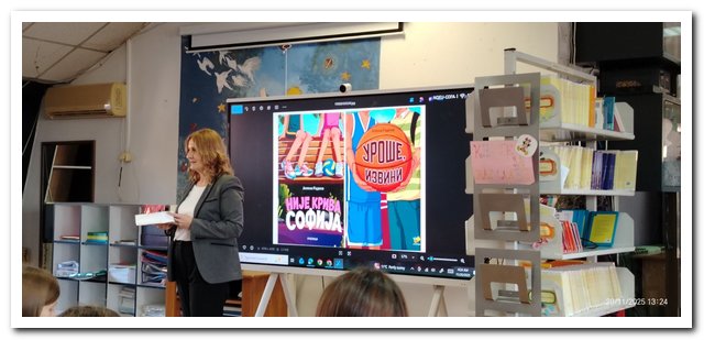 Промоција књига Јелене Радеке „Није крива Софија“ и „Уроше, извини“Поводом Међународног дана детета (20. новембар) за ученике од 5. до 8. разреда у школској библиотеци одржана је промоција књига Јелене Радеке „Није крива Софија“ и „Уроше, извини“. Ученици су уживали у разговору са ауторком и…