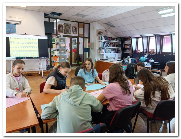 Дан словенске писменостиДан словенске писмености 24. маја обележили смо са члановима Библиотечке секције 5. и 6. разреда. Ученици су писали своја имена глагољицом и на веома занимљив начин се упознали са првим словенским писмом.