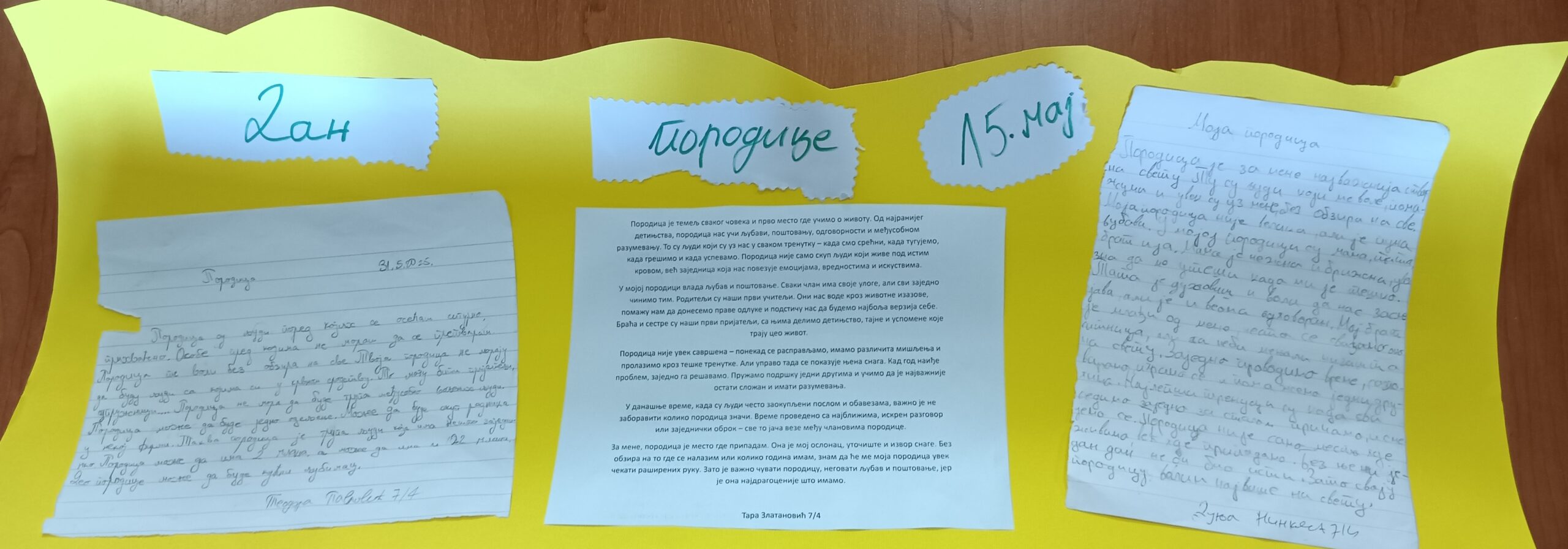 Дан породицеОбележили смо Дан породице 15. маја са ученицама 7/4 Дуњом Нинковић, Таром Златановић и Теодором Павловић које су написале састав „Породица, највеће благо на свету“.