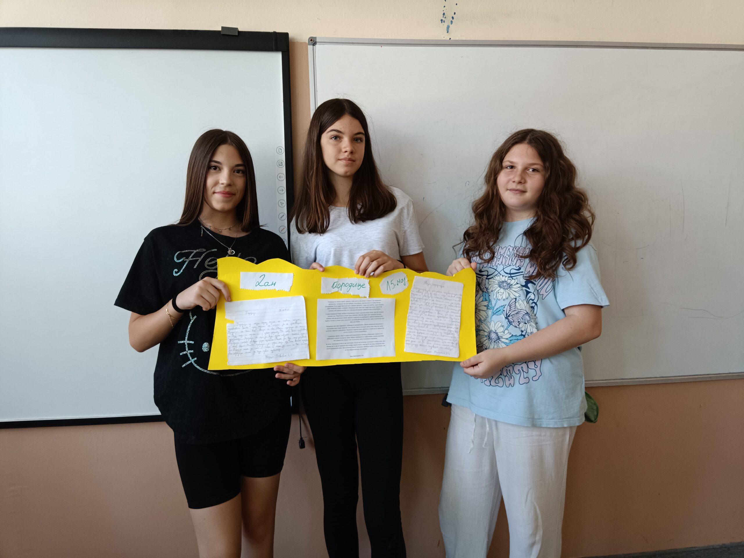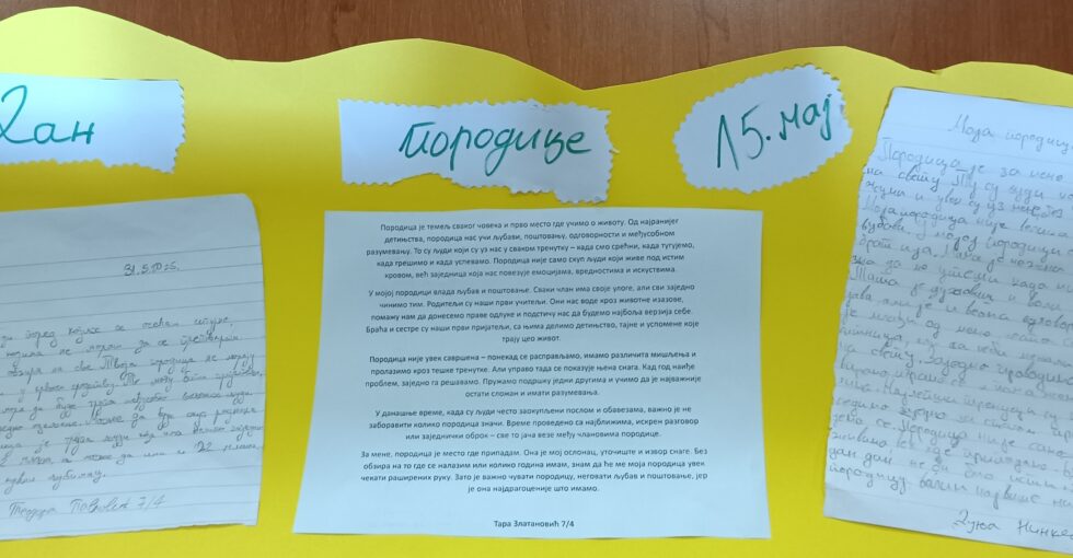 Обележили смо Дан породице 15. маја са ученицама 7/4 Дуњом Нинковић, Таром Златановић и Теодором Павловић које су написале састав „Породица, највеће благо на свету“.