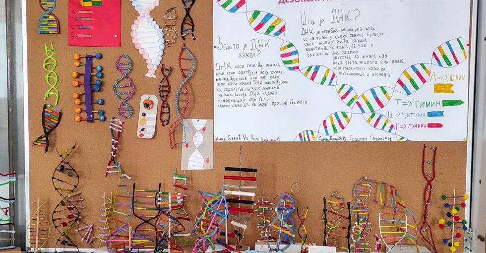 Ученици 5. разреда су инспирисани лекцијама из биологије направили пано и моделе ДНК  и представили свој рад у холу наше школе.