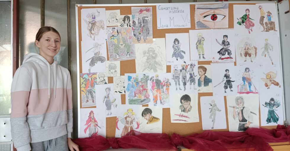 Јана Милошевић, ученица 6/2, направила је своју ликовну изложбу у холу наше школе. Цртежи које је осликала настали су као инспирација аниме јапанским цртаним филмовима.
