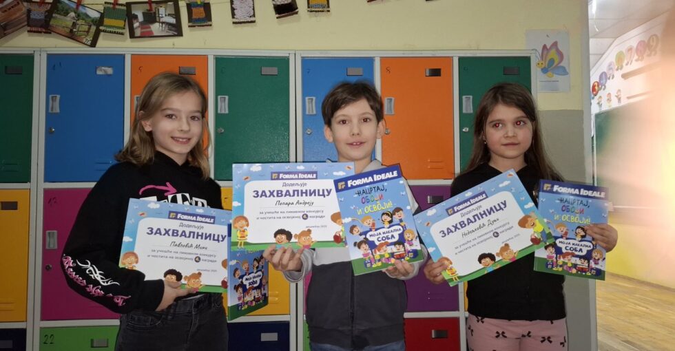Ученици првог разреда наше школе освојили су четврто место на конкурсу Моја идеална соба у организацији фирме “Форма Идеале”. Као награде добили су захвалницу и идеалну свеску. Честитамо нашим награђеним ученицима: Дуњи Недељковић 1/1, Андреју Попари 1/5 и Мини Павловић 1/5.